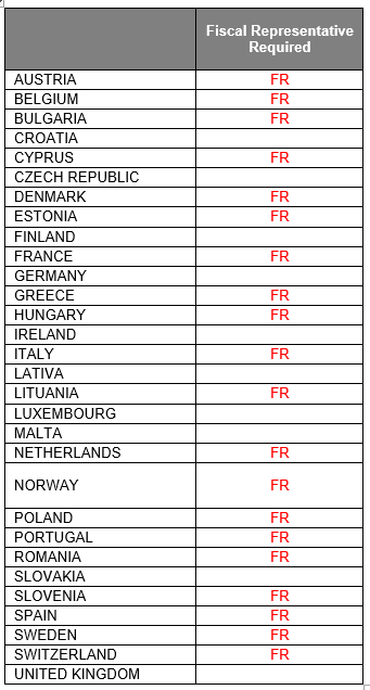 Fiscal representatives are jointly and severely liable for the VAT owed by a non-EU company and will incur extra fees and possible bank guarantees in countries such as France, Italy, and Spain.Over half of EU member states have this stipulation. The countries listed below in Red, require you to do so.