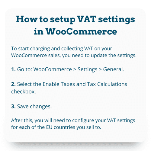 To start charging and collecting VAT on your WooCommerce sales, you need to update the settings.
